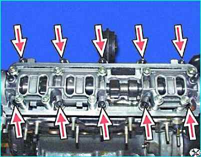 Выньте болты с шайбами. Расположение болтов крепления головки блока
