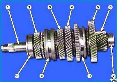 Установите вал шестерни 1-ой передачи на губки тисков и ударами деревянной киянки по торцу вала спрессуйте синхронизатор 1-ой и 2-ой передач со шлицев вала.