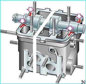 Укладываем вал в опоры головки блока цилиндров таким образом, чтобы кулачки первого цилиндра были направлены вверх.