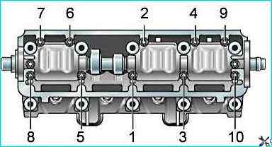 Предварительно затягиваем гайки в последовательности, указанной на рис. 10, до прилегания поверхностей корпусов подшипников к головке блока цилиндров.