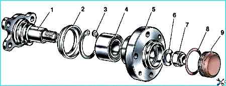 После запрессовки установите стопорное кольцо 3 (см. рис. 2) и запрессуйте ось 1 ступицы.