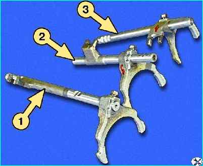 1 — шток с вилкой включения; 5 - ой передачи; 2 — шток с вилкой включения; 3 - ей и 4 - ой передач; 3 — шток с вилкой включения 1-ой и 2 - ой передач