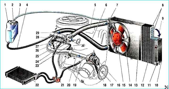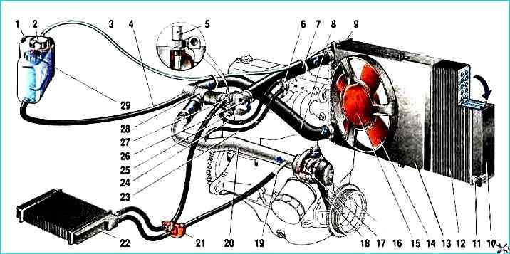 Система охлаждения двигателя BA3-21083: 1 - расширительный бачок; 2 - пробка расширительного бачка; 3 - пароотводящий шланг; 4 - шланг от расширительного бачка к термостату; 5 - подводящий шланг радиатора; 6 - отводящий шланг радиатора; 7 - левый бачок радиатора; 8 - алюминиевые трубки радиатора; 9 - датчик включения электровентилятора; 10 - правый бачок радиатора; 11 - сливная пробка; 12 - сердцевина радиатора; 13 - кожух электровентилятора; 14 - крыльчатка электровентилятора; 15 - электродвигатель; 16 - зубчатый шкив насоса; 17 - крыльчатка насоса; 18 - зубчатый ремень привода распределительного вала; 19 - отводящий патрубок радиатора отопителя; 20 - подводящая труба насоса; 21 - кран; 22 - радиатор отопителя; 23 - шланг отвода жидкости от подогрева впускной трубы к блоку подогрева карбюратора; 24 - блок подогрева карбюратора; 25 - выпускной патрубок; 26 - подводящий патрубок отопителя; 27 - шланг отвода жидкости от подогрева впускной трубы и блока подогрева карбюратора: 28 - датчик указателя температуры охлаждающей жидкости; 29 - термостат.