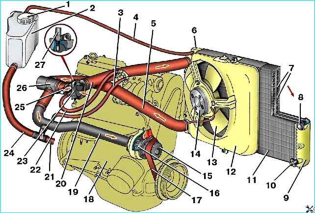 Охлаждающая жидкость заливается через наливную горловину расширительного бачка 2, пробка 1 которого имеет впускной и выпускной клапаны.