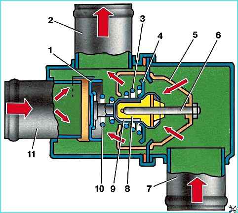 Термостат необходимо заменять, если температура начала открытия основного клапана не соответствует (85 ±2)°С или в случае, если при достижении температуры до 102°С не происходит касания клапана 1 седла патрубка 11