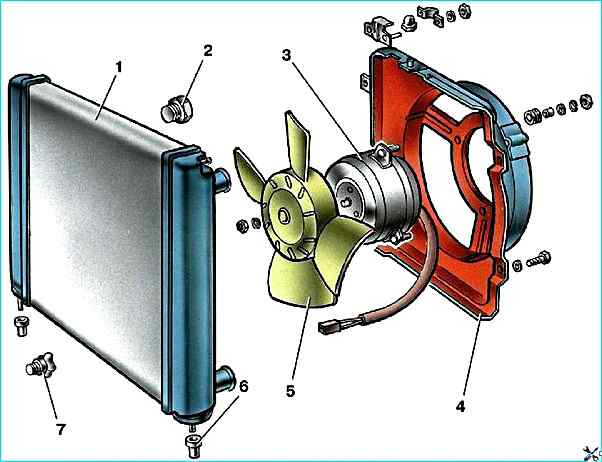 Отверните гайки и болты крепления кожуха 4 и, придерживая радиатор, выньте кожух в сборе с электровентилятором