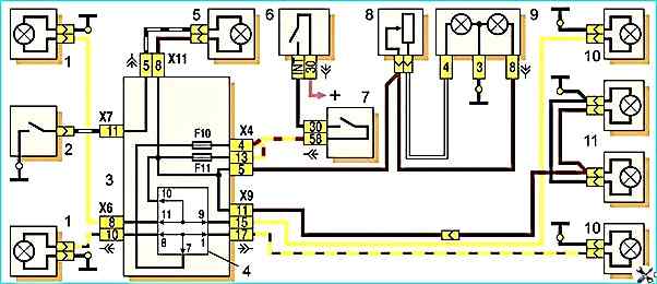 Лампы габаритного света и стоп-сигнала запитаны через реле контроля исправности ламп в монтажном блоке