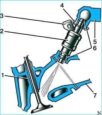 Форсунка системы распределенного впрыска представляет собой электромагнитное устройство, дозирующее подачу топлива под давлением во впускную трубу двигателя Форсунки закреплены на рампе с помощью пружинных фиксаторов 4.