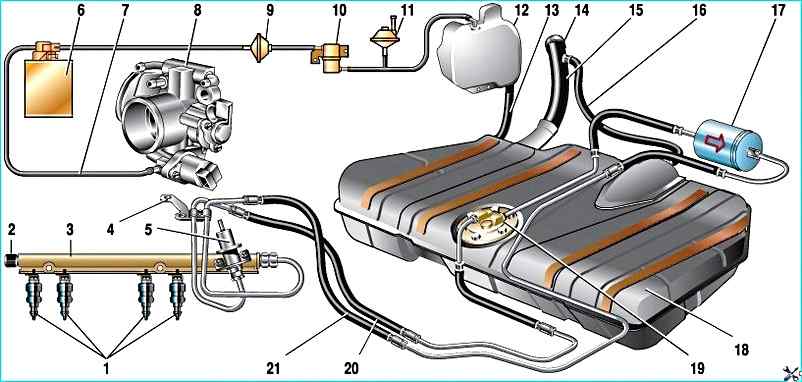 Схема системы подачи топлива: 1 – форсунки; 2 – пробка штуцера для контроля давления топлива; 3 – рампа форсунок; 4 – кронштейн крепления топливных трубок; 5 – регулятор давления топлива 6 – адсорбер с электромагнитным клапаном; 7 – шланг для отсоса паров бензина из адсорбера; 8 – дроссельный узел; 9 – двухходовой клапан; 10 – гравитационный клапан; 11 – предохранительный клапан 12 – сепаратор 13 – шланг сепаратора; 14 – пробка топливного бака; 15 – наливная труба; 16 – шланг наливной трубы; 17 – топливный фильтр; 18 – топливный бак; 19 – электробензонасос; 20 – сливной топливопровод; 21 – подающий топливопровод