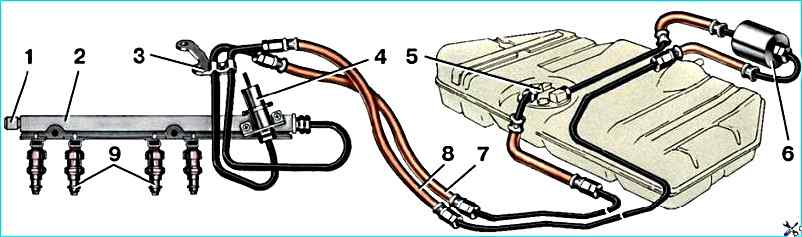 От насоса по гибкому шлангу топливо под давлением подается к фильтру тонкой очистки и далее — через стальные топливопроводы и резиновые шланги — к топливной рампе.