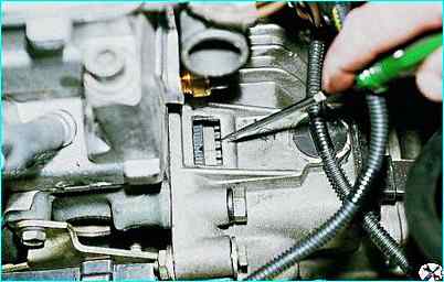 Отожмите отверткой пружинную скобу на колодке и отсоедините колодку с проводами от низковольтной клеммы распределителя зажигания.