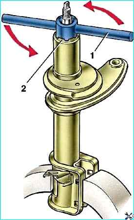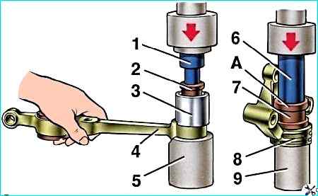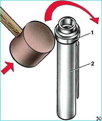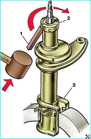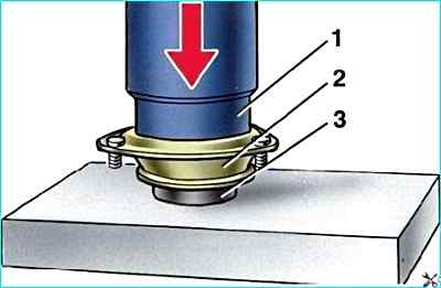 – снимите опору 2 (см. рис. 7) буфера хода сжатия, для чего легкими ударами молотка по плоской выколотке обстукивайте опору снизу вверх и по кругу;