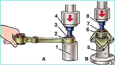 Выпрессовку изношенных, поврежденных или разрушенных резинометаллических шарниров стоек стабилизатора проводите на прессе специальными оправками.