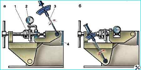 Установите динамометрический ключ 3 в верхнее гнездо приспособления и, приложив к нему момент 196 Нм (20 кгсм) попеременно в обе стороны, определите по индикатору суммарный радиальный зазор в шаровом шарнире. Если он превышает 0,7 мм шарнир замените новым.