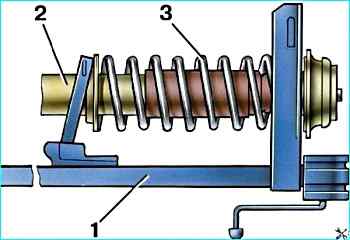 При сборке рычага с растяжкой установите на место снятые регулировочные шайбы так, чтобы фаски на них были обращены в сторону упорного торца растяжки.