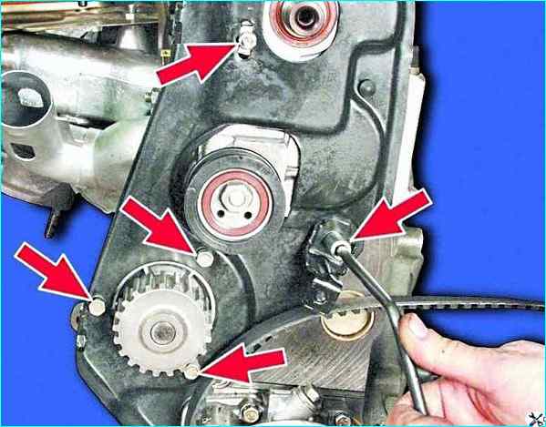 Отверните три болта крепления передней крышки привода распределительного вала и снимите ее