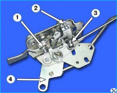 рис. 1. Замок двери: 1 - рычаг выключателя замка 2 - рычаг наружного привода (ручки) 3 - рычаг внутреннего привода (ручки) 4 - рычаг блокировки