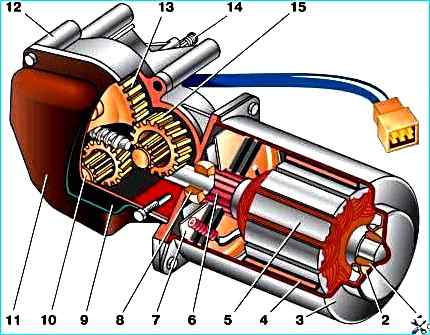Очиститель ветрового стекла: 1 - задняя втулка вала якоря 2 - войлочное кольцо 3 - корпус электродвигателя 4 - постоянный магнит: 5 - якорь 6 - коллектор 7 - траверса со щеткодержателями, дросселями и термобиметаллическими предохранителями 8 - передняя втулка вала якоря 9 - панель с помехоподавительными конденсаторами и контактами концевого выключателя 10 - блок промежуточных шестерен 11 - крышка 12 - корпус редуктора 13 - ведомая шестерня 14 - выходной вал моторедуктора 15 - блок промежуточных шестерен