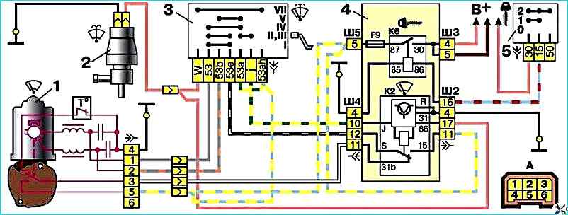 Схема включения омывателя и очистителя ветрового стекла: 1 - электродвигатель очистителя ветрового стекла 2 - электродвигатель омывателя ветрового стекла 3 - переключатель очистителя и омывателя ветрового стекла 4 - монтажный блок 5 - выключатель зажигания К2 - реле очистителя ветрового стекла К6 - дополнительное реле А - условная нумерация штекеров в колодке электродвигателя очистителя В - к источникам питания