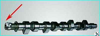 В отличие от двигателя ВАЗ-2111 с попарно-параллельным впрыском топлива (за каждый рабочий цикл форсунки открываются дважды) на двигателе ВАЗ-21114 применен фазированный впрыск поэтому на новой модели двигателя применен распределительный вал со специальным штифтом, предназначенным для работы датчика фаз (штифт показан стрелкой)
