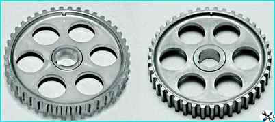 Шкив распределительного вала двигателя ВАЗ-21114 (справа) отличается от шкива двигателя ВАЗ-2111 (слева) смещенной на два градуса меткой для установки фаз газораспределения