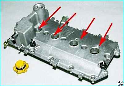 Крышка головки блока цилиндров двигателя ВАЗ-21124 не имеет площадки для крепления модуля зажигания, и в ней выполнены резьбовые отверстия для крепления катушек зажигания.