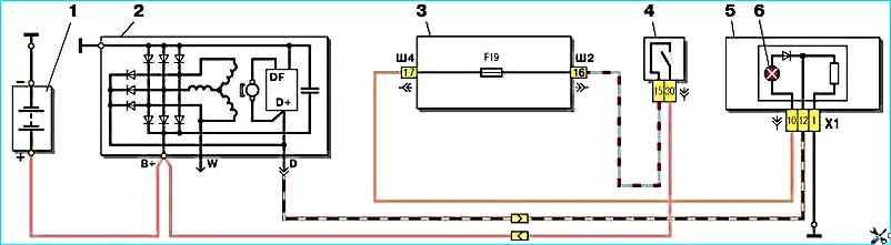Схема соединений генератора 94.3701: 1 - аккумуляторная батарея 2 - генератор 3 - блок реле и предохранителей (монтажный блок) 4 - выключатель зажигания 5 - комбинация приборов 6 - контрольная лампа разряда аккумуляторной батареи (устанавливается с 1997 г., до 1997 года устанавливался электронный вольтметр со светодиодом)