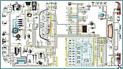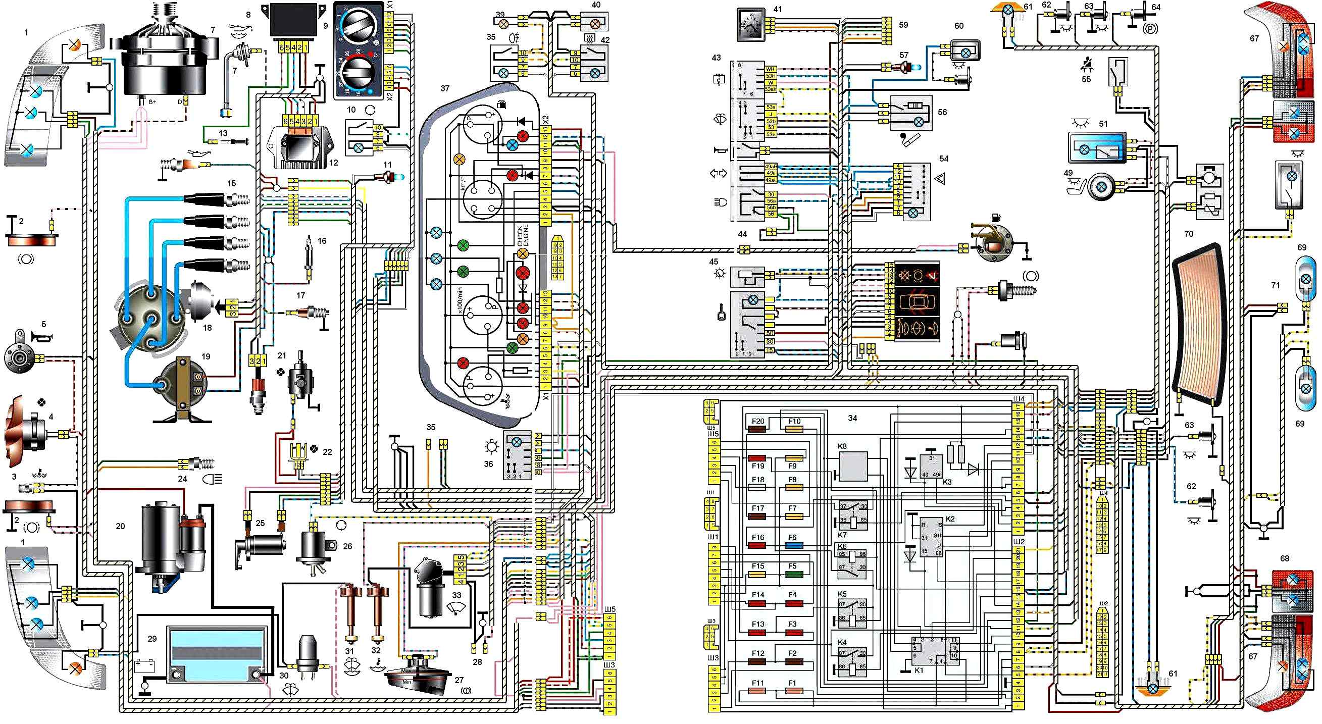 Схема электрооборудования автомобиля ВАЗ-2110: 1 – блок-фара 2 – датчики износа колодок передних тормозов 3 – датчик включения электродвигателя вентилятора 4 – электродвигатель вентилятора системы охлаждения двигателя 5 – звуковой сигнал 6 – генератор 7 – датчик уровня масла 8 – блок управления электромагнитным клапаном карбюратора 9 – контроллер отопителя 10 – выключатель клапана рециркуляции 11 – лампа подсветки рычагов управления отопителем 12 – коммутатор 13 – концевой выключатель карбюратора 14 – датчик контрольной лампы давления масла 15 – свечи зажигания 16 – электромагнитный клапан карбюратора 17 – датчик указателя температуры охлаждающей жидкости 18 – датчик-распределитель зажигания 19 – катушка зажигания 20 – стартер 21 – электродвигатель вентилятора отопителя 22 – дополнительный резистор электродвигателя отопителя 23 – датчик скорости 24 – выключатель света заднего хода 25 – микромоторедуктор привода заслонки отопителя 26 – клапан рециркуляции 27 – датчик уровня тормозной жидкости 28 – колодки для подключения электродвигателя омывателя заднего стекла 29 – аккумуляторная батарея 30 – электродвигатель омывателя ветрового стекла 31 – датчик уровня омывающей жидкости 32 – датчик уровня охлаждающей жидкости 33 – моторедуктор очистителя ветрового стекла 34 – монтажный блок 35 – колодки для подключения жгута предупредительного света 37 – комбинация приборов 38 – выключатель заднего противотуманного света 39 – контрольная лампа противотуманного света 40 – контрольная лампа обогрева заднего стекла 41 – часы 42 – выключатель обогрева заднего стекла 43 – подрулевой переключатель 44 – колодка для переключения проводов при установке блок-фар другого типа 45 – регулятор освещения приборов 46 – выключатель зажигания 47 – колодки для подключения жгута проводов очистителей фар 48 – розетка для переносной лампы 49 – передний плафон освещения салона 50 – выключатель стоп-сигнала 51 – плафон освещения салона 52 – блок бортовой системы контроля 53 – датчик указателя уровня топлива 54 – выключатель аварийной сигнализации 55 – датчик ремня безопасности водителя 56 – прикуриватель 57 – лампа подсветки пепельницы 58 – выключатель лампы освещения вещевого ящика 59 – колодка для подключения бортового компьютера 60 – лампа освещения вещевого ящика 61 – боковые указатели поворота 62 – выключатели в стойках передних дверей 63 – выключатели в стойках задних дверей 64 – выключатель контрольной лампы стояночного тормоза 65 – фонарь освещения багажника 66 – датчик температуры для системы отопления 67 – наружные задние фонари 68 – внутренние задние фонари 69 – фонари освещения номерного знака 70 – элемент обогрева заднего стекла 71 – колодка для подключения дополнительного стоп- сигнала 36 – переключатель наружного освещения