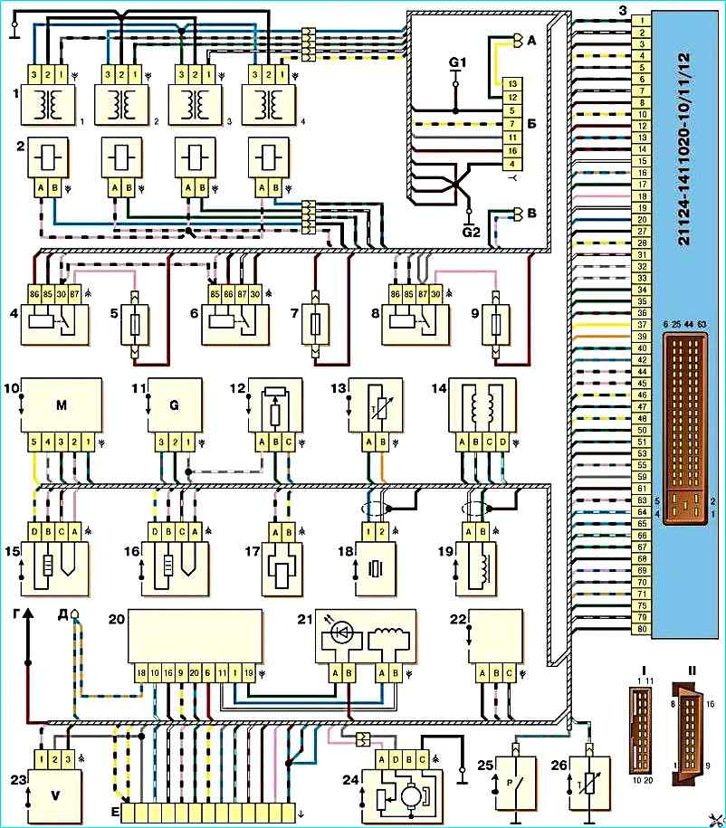 Схема соединений системы управления двигателем ВАЗ-21124 с распределенным впрыском топлива под нормы токсичности Евро-3 (контроллер M7.9.7): 1 – катушки зажигания; 2 – форсунки; 3 – контроллер; 4 – главное реле; 5 – предохранитель, соединенный с главным реле; 6 – реле электровентилятора системы охлаждения; 7 – предохранитель, соединенный с реле электровентилятора системы охлаждения; 8 – реле электрического топливного насоса; 9 – предохранитель, соединенный с реле электрического топливного насоса; 10 – датчик массового расхода и температуры воздуха; 11 – датчик неровной дороги; 12 – датчик положения дроссельной заслонки; 13 – датчик температуры охлаждающей жидкости; 14 – регулятор холостого хода; 15 – управляющий датчик кислорода; 16 – диагностический датчик кислорода; 17 – электромагнитный клапан продувки адсорбера; 18 – датчик детонации; 19 – датчик положения коленчатого вала; 20 – блок управления иммобилайзера; 21 – индикатор состояния иммобилайзера; 22 – датчик фаз; 23 – датчик скорости автомобиля; 24 – модуль электрического топливного насоса с датчиком уровня топлива; 25 – датчик контрольной лампы давления масла 26 – датчик указателя температуры охлаждающей жидкости; А – колодка, присоединяемая к жгуту проводов салонной группы АБС; Б – колодка диагностики; В – колодка, присоединяемая к жгуту проводов кондиционера; Г – к выводу "+" аккумуляторной батареи; Д – к колодке жгута проводов боковых дверей; Е – колодка, присоединяемая к жгуту проводов панели приборов G1, G2 – точки заземления I – порядок условной нумерации штекеров в колодке блока управления иммобилайзера II – порядок условной нумерации контактов в колодке диагностики