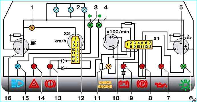 Схема соединений контрольных приборов: 1 - контрольная лампа резерва топлива 2 - лампы освещения комбинации приборов 3 - контрольная лампа правого поворота 4 - контрольная лампа левого поворота 5 - указатель температуры охлаждающей жидкости 6 - контрольная лампа наружного освещения 7 - контрольная лампа давления масла 8 - контрольная лампа стояночного тормоза 9 - контрольная лампа заряда батареи 10 - тахометр 11 - контрольная лампа "Check engine” 12 - спидометр 13 - контрольная лампа уровня тормозной жидкости 14 - контрольная лампа аварийной сигнализации 15 - контрольная лампа дальнего света фар 16 - указатель уровня топлива