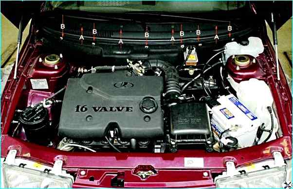 Крестообразной отверткой отворачиваем шесть саморезов крепления обивок моторного отсека к облицовке
