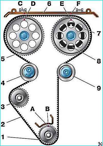 Убеждаемся в совмещении установочных меток коленчатого и распределительных валов.