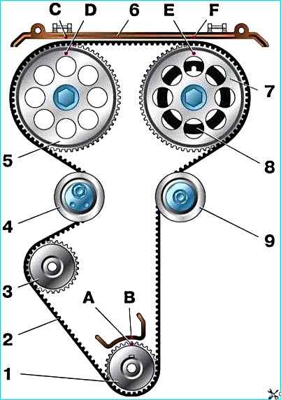 Схема привода распределительных валов ВАЗ-2112: 1 - зубчатый шкив коленчатого вала 2 - зубчатый ремень 3 - шкив насоса охлаждающей жидкости 4 - натяжной ролик 5 - шкив выпускного распределительного вала 6 - задняя защитная крышка зубчатого ремня 7 - шкив впускного распределительного вала 8 - кольцо для датчика фаз 9 - опорный ролик (А) - метка ВМТ на зубчатом шкиве коленчатого вала (B) - установочная метка на крышке масляного насоса (C) и (F) - установочные метки на задней защитной крышке зубчатого ремня (D) - установочная метка на шкиве выпускного распределительного вала (Е) - установочная метка на шкиве впускного распределительного вала