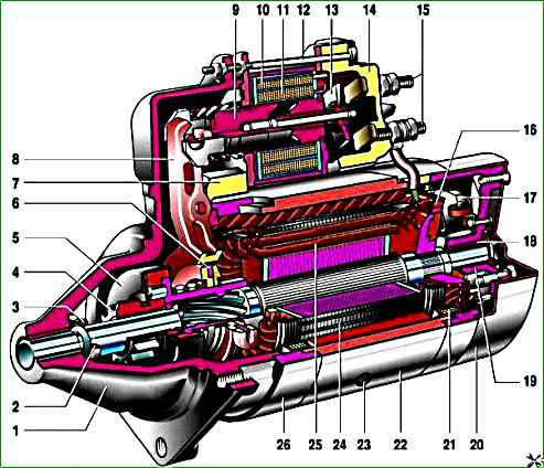 Стартер 35.3708 в сборе: 1 - крышка со стороны привода; 2 - стопорное кольцо; 3 - ограничительное кольцо; 4 - шестерня привода; 5 - обгонная муфта; 6 - поводковое кольцо; 7 - резиновая заглушка; 8 - рычаг привода; 9 - якорь реле; 10 - удерживающая обмотка тягового реле; 11 - втягивающая обмотка тягового реле; 12 - стяжной болт реле; 13 - контактная пластина; 14 - крышка реле; 15 - контактные болты; 16 - коллектор; 17 - щетка; 18 - втулка вала якоря; 19 - крышка, со стороны коллектора; 20 - кожух; 21 - шунтовая катушка обмотки статора; 22 - корпус; 23 - винт крепления полюса статора; 24 - якорь; 25 - обмотка якоря; 26 - промежуточное кольцо