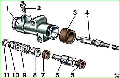 Выверните пробку, снимите защитный колпачок 3 вместе с толкателем 4, выньте поршень и разберите его, предварительно сняв стопорное кольцо 11.