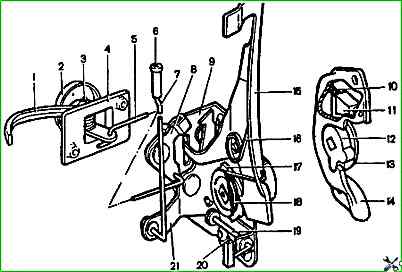Замок левой передней двери: 1 - внутренняя ручка привода замка; 2 - облицовка внутренней ручки; 3 - ось; 4 - кронштейн внутренней ручки; 5 - тяга внутренней ручки; 6 - кнопка блокировки замка; 7 - тяга кнопки блокировки; 8 - рычаг внутреннего привода замка; 9 - корпус замка; 10 - пружина сухаря; 11 - сухарь фиксатора замка; 12 - ротор; 13 - опора центрального валика; 14 - корпус фиксатора; 15 - рычаг наружного привода; 16 - пружина рычага наружного привода; 17 - храповик; 18 - пружина храповика; 19 - валик выключения замка; 20 - тяга выключения замка; 21 - рычаг блокировки замка