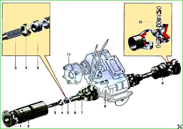 Карданные валы: 1 – фланец-вилка карданного шарнира; 2 – передний карданный вал; 3 – наконечник карданного вала; 4 – обойма сальника; 5 – сальник; 6 – скользящая вилка; 7 – пресс-масленка; 8 – раздаточная коробка; 9 – задний карданный вал; 10 – крестовина карданного вала; 11 – промежуточный вал