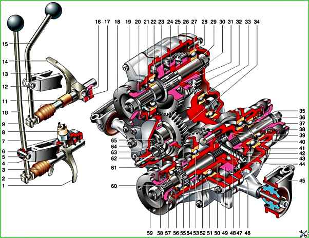 Раздаточная коробка с приводом: 1 – вилка муфты блокировки дифференциала; 2 – шток вилки блокировки дифференциала; 3 – защитный чехол штока; 4 – стопорная шайба; 5 – втулка оси рычага; 6 – ось рычага; 7 – стопорный болт вилки; 8 – выключатель контрольной лампы блокировки дифференциала; 9 – шток вилки переключения передач; 10 – рычаг блокировки дифференциала; 11 – дистанционная втулка; 12 – ось рычага переключения передач; 13 – кронштейны; 14 – вилка муфты переключения передач; 15 – рычаг переключения передач; 16 – втулка пружины фиксатора; 17 – пружина и шарик фиксатора; 18 – фланец ведущего вала; 19 – передняя крышка; 20 – сальник ведущего вала; 21 – упорное кольцо подшипника; 22 – передний подшипник ведущего вала; 23 – шестерня высшей передачи; 24 – муфта переключения передач; 25 – картер раздаточной коробки; 26 – шестерня низшей передачи; 27 – задний подшипник ведущего вала; 28 – установочное кольцо заднего подшипника ведущего вала; 29 – ведущий вал; 30 – втулка; 31 – ступица; 32 – задняя крышка; 33 – задний подшипник промежуточного вала; 34 – промежуточный вал; 35 – подшипник вала привода заднего моста; 36 – задний подшипник дифференциала; 37 – фланец; 38 – сальник вала привода заднего моста; 39 – задний корпус дифференциала; 40 – опорная шайба шестерни; 41 – шестерня привода заднего моста; 42 – ось сателлитов; 43 – стопорное кольцо; 44 – пружинная шайба; 45 – кронштейн подвески; 46 – упорная шайба сателлита; 47 – картер привода переднего моста; 48 – сателлит; 49 – ведомая шестерня дифференциала; 50 – передний корпус дифференциала; 51 – стопорное кольцо; 52 – пружинная шайба; 53 – передний подшипник корпуса дифференциала; 54 – муфта блокировки дифференциала; 55 – установочное кольцо переднего подшипника дифференциала; 56 – маслоотражатель; 57 – сальник вала привода переднего моста; 58 – подшипник вала привода переднего моста; 59 – фланец вала привода переднего моста; 60 – вал привода переднего моста; 61 – пробка слива масла; 62 – ведомая шестерня привода спидометра; 63 – роликовый подшипник промежуточного вала; 64 – заливная пробка; 65 – ведущая шестерня привода спидометра