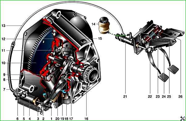 Сцепление и его гидропривод: 1 - толкатель вилки выключения сцепления; 2 - регулировочная гайка; 3 - контргайка; 4 - рабочий цилиндр гидропривода выключения сцепления; 5 - оттяжная пружина вилки; 6 - штуцер для прокачки; 7 - гибкий шланг гидропривода сцепления; 8 - центральная нажимная диафрагменная пружина; 9 - нажимной диск; 10 - маховик; 11 - пружина демпфера; 12 - ведомый диск; 13 - трубопровод; 14 - бачок гидропривода; 15 - картер сцепления; 16 - первичный вал коробки передач; 17 - муфта подшипника выключения сцепления; 18 - подшипник выключения сцепления; 19 - шаровая опора вилки выключения сцепления; 20 - вилка выключения сцепления; 21 - главный цилиндр привода выключения сцепления; 22 - педаль сцепления; 23 - оттяжная пружина педали сцепления; 24 - педаль тормоза; 25 - сервопружина; 26 - ось педалей