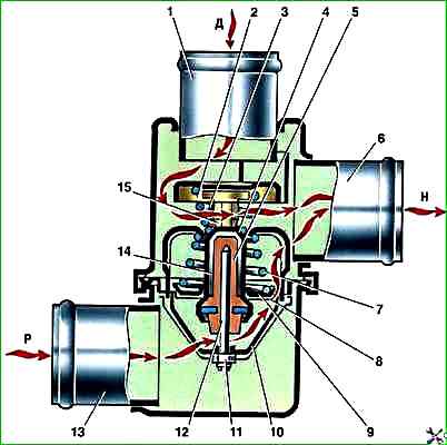 Термостат: 1 - входной патрубок (от двигателя); 2 - перепускной клапан; 3 - пружина перепускного клапана; 4 - стакан; 5 - резиновая вставка; 6 - выходной патрубок; 7 - пружина основного клапана; 8 - седло основного клапана; 9 - основной клапан; 10 - держатель; 11 - регулировочная гайка; 12 - поршень; 13 - входной патрубок (от радиатора); 14 - наполнитель; 15 - обойма; Д - вход жидкости от двигателя; Р - вход жидкости от радиатора; Н - выход жидкости к насосу