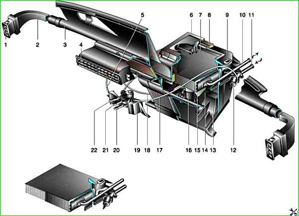 Система отопления и вентиляции: 1 – боковое сопло; 2 – воздухопровод бокового сопла; 3 – воздухопровод обогрева ветрового стекла; 4 – центральные сопла; 5 – тяга управления заслонкой воздухопритока; 6 – заслонка воздухопритока; 7 – радиатор; 8 – уплотнитель отопителя; 9 – кожух радиатора; 10 – отводящий патрубок; 11 – подводящий патрубок; 12 – кран; 13 – воздухораспределительная крышка; 14 – кожух вентилятора; 15 – крыльчатка; 16 – электродвигатель; 17 – тяга управления краном; 18 – тяга управления заслонкой обогрева ветрового стекла; 19 – кронштейн рычагов управления отопителем; 20 – рукоятка управления заслонкой воздухопритока; 21 – рукоятка управления заслонкой обогрева ветрового стекла; 22 – рукоятка управления краном