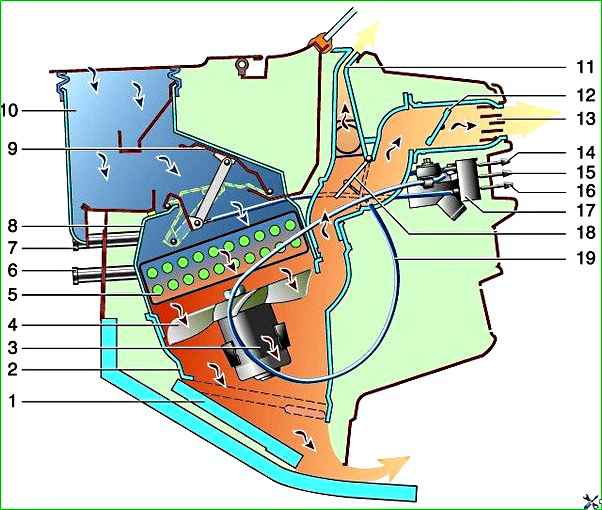 Схема работы отопителя: 1 – воздухораспределительная крышка; 2 – кожух вентилятора; 3 – электродвигатель вентилятора; 4 – крыльчатка; 5 – радиатор; 6– подводящий патрубок; 7 – отводящий патрубок; 8 – кожух радиатора; 9 – заслонка воздухопритока; 10 – коробка воздухопритока; 11 – воздухопровод обогрева ветрового стекла; 12 – заслонка центрального сопла; 13 – центральное сопло; 14 – рукоятка управления краном; 15 – рукоятка управления заслонкой обогрева ветрового стекла; 16 – рукоятка управления заслонкой воздухопритока; 17 – кронштейн рычагов управления; 18 – заслонка обогрева ветрового стекла; 19 – тяга управления заслонкой обогрева ветрового стекла