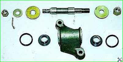 Отсоединив от маятникового рычага шаровые пальцы средней и боковой тяг, отворачиваем регулировочную гайку и вынимаем маятниковый рычаг с осью