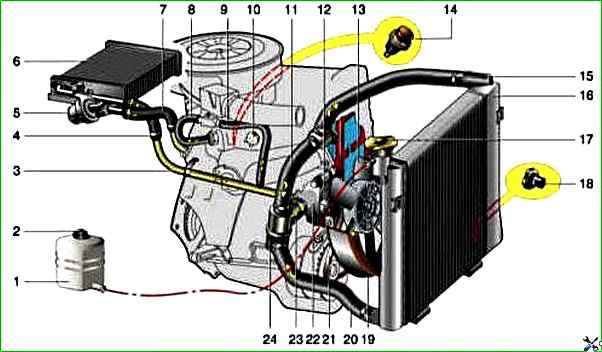 Система охлаждения BA3-21213: 1 - расширительный бачок; 2 - пробка расширительного бачка; 3 - труба отвода жидкости от радиатора отопителя; 4 - шланг отвода жидкости от радиатора отопителя; 5 - кран отопителя; 6 - радиатор отопителя; 7 - шланг подвода жидкости к радиатору отопителя; 8 - шланг подвода жидкости к блоку подогрева карбюратора; 9 - шланг отвода жидкости от блока подогрева карбюратора; 10 - термовакуумный выключатель клапана рециркуляции; 11 - перепускной (байпасный) шланг термостата; 12 - крышка насоса охлаждающей жидкости; 13 - крыльчатка вентилятора; 14 - датчик температуры охлаждающей жидкости для комбинации приборов; 15 - подводящий шланг радиатора; 16 - радиатор; 17 - пробка радиатора; 18 - сливная пробка радиатора; 19 - кожух вентилятора; 20 - отводящий шланг радиатора; 21 - ремень привода насоса охлаждающей жидкости; 22 - корпус насоса охлаждающей жидкости; 23 - шланг подачи охлаждающей жидкости в насос; 24 - термостат