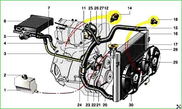 Система охлаждения ВАЗ-21214: 1 - расширительный бачок; 2 - пробка расширительного бачка; 3 - труба отвода жидкости от радиатора отопителя; 4 - шланг отвода жидкости от радиатора отопителя; 5 - кран отопителя; 6 - радиатор отопителя; 7 - шланг подвода жидкости к радиатору отопителя; 8 - шланг подвода жидкости к блоку подогрева карбюратора; 9 - шланг отвода жидкости от блока подогрева карбюратора; 10 - термовакуумный выключатель клапана рециркуляции; 11 - перепускной (байпасный) шланг термостата; 12 - крышка насоса охлаждающей жидкости; 13 - крыльчатка вентилятора; 14 - датчик температуры охлаждающей жидкости для комбинации приборов; 15 - подводящий шланг радиатора; 16 - радиатор; 17 - пробка радиатора; 18 - сливная пробка радиатора; 19 - кожух вентилятора; 20 - отводящий шланг радиатора; 21 - ремень привода насоса охлаждающей жидкости; 22 - корпус насоса охлаждающей жидкости; 23 - шланг подачи охлаждающей жидкости в насос; 24 - термостат; 25 - шланг подвода охлаждающей жидкости к дроссельному узлу; 26 - шланг отвода охлаждающей жидкости от дроссельного узла; 27 - датчик температуры охлаждающей жидкости для системы впрыска; 28 - крыльчатка электровентилятора; 29 - электродвигатель; 30 - кожух электровентиляторов