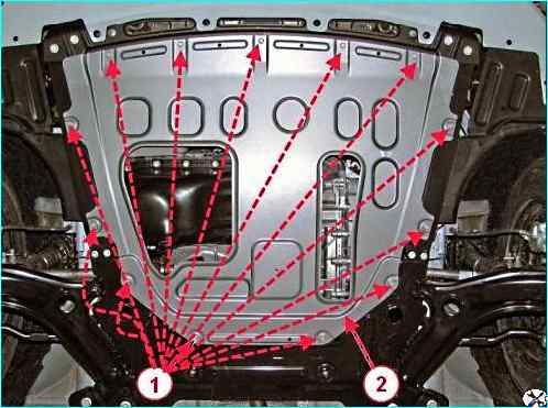 Головкой на 10 отворачиваем тринадцать болтов 1, рисунок 10, крепления и снимаем брызговик 2 двигателя.