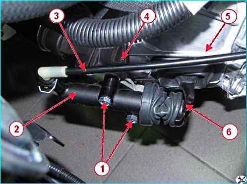 Головкой на 13 откручиваем два болта 1, рисунок 11, крепления, снимаем цилиндр 2 гидропривода сцепления, не отсоединяя от трубки 3 гидропривода, и подвешиваем цилиндр на технологический крючок.