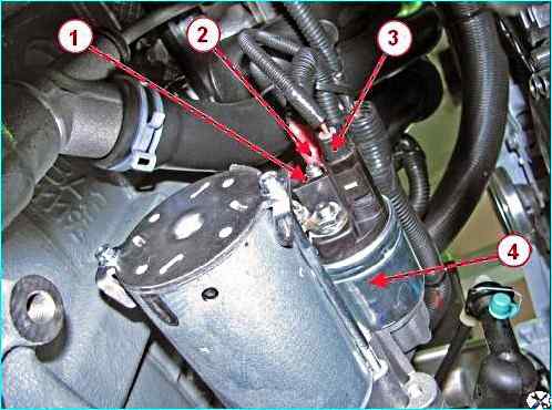 Головкой на 13 откручиваем гайку 1, рисунок 12, и отсоединяем от тягового реле стартера 4 клемму 2 и колодку 3 жгута проводов.