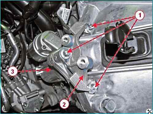 Головкой Torx E10 отворачиваем три болта 1, рисунок 13, снимаем кронштейн 2 крепления цилиндра гидропривода сцепления (для автомобилей с МКП) и стартер 3.
