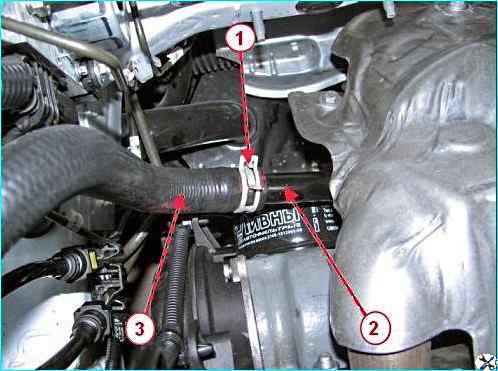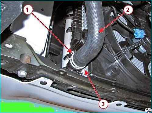 - - плоскогубцами разжимаем хомут 1, рисунок 14, крепления и отсоединяем отводящий шланг 2 от патрубка радиатора 3;
